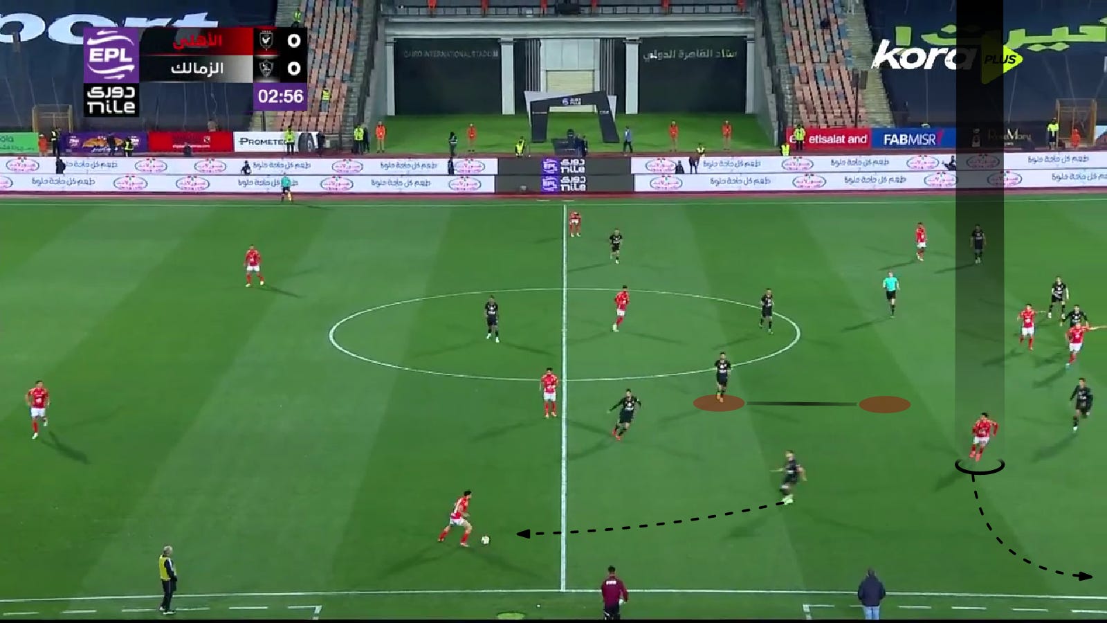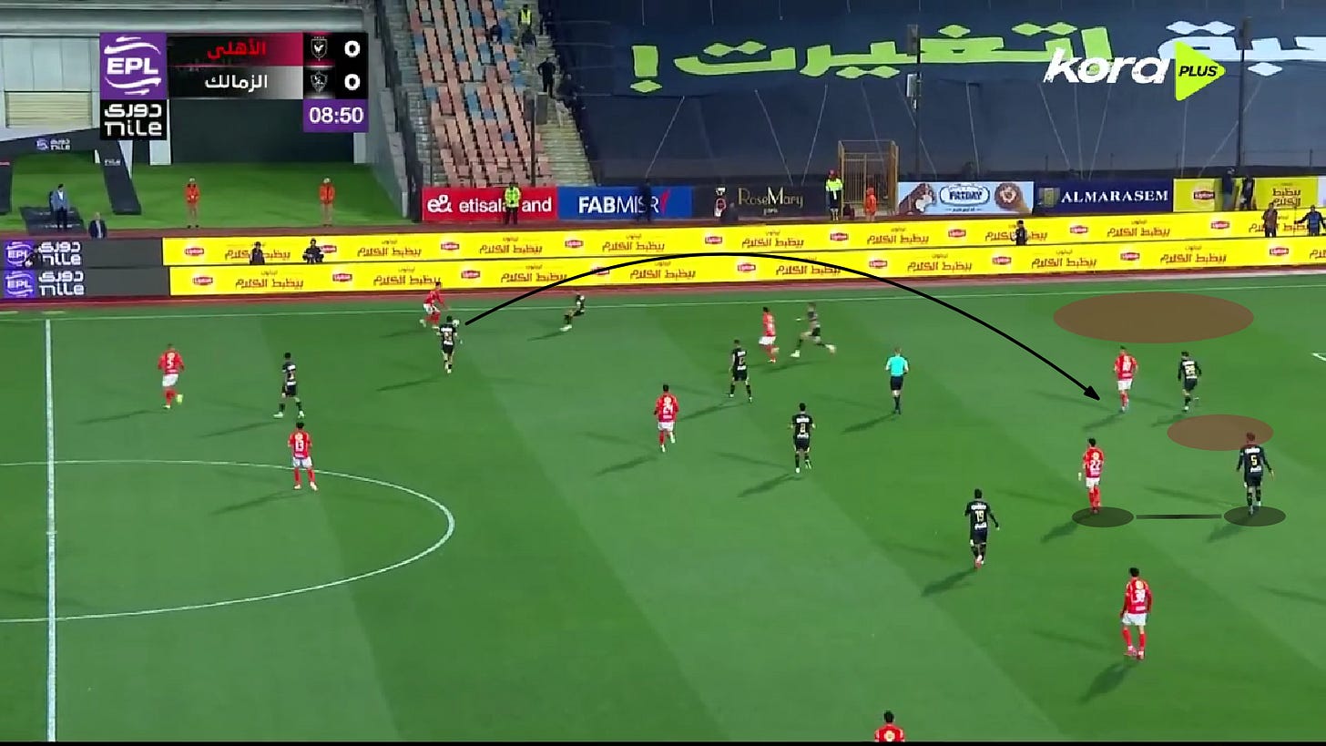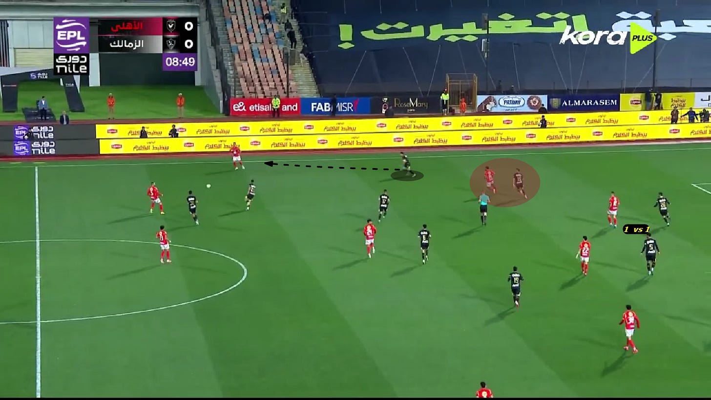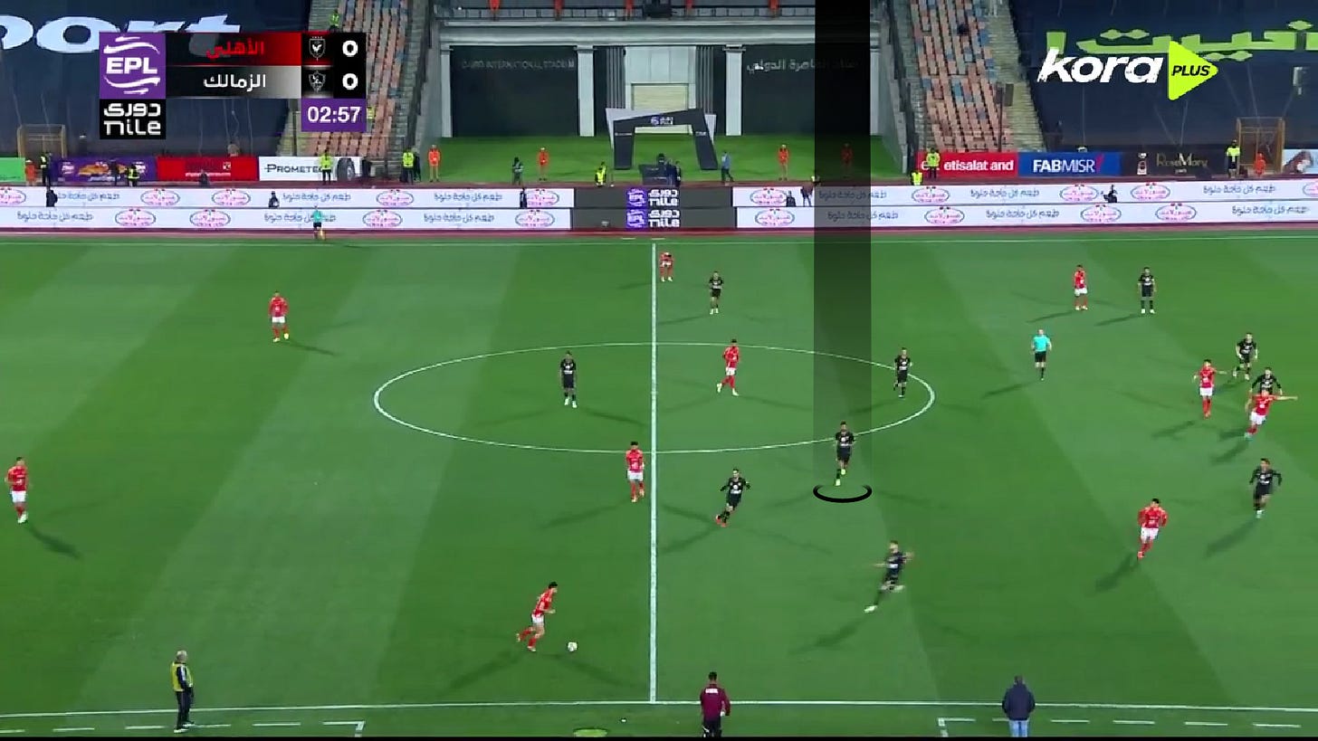 محمد عبد الله جناح الفريق يبدأ في عملية التحرك من الداخل للخارج في إشارة واضحة لاكرم توفيق للعب الكرة الطولية خلف حسام عبد المجيد الذي بدوره قام بستباقية علي محمد عبد الله جناح الاهلي , ولماذا الكرة الطولية ؟ لأن جراديشار وامام عاشور في موقف 1 ضد 1 مع قلبي دفاع الزمالك ويمكنهما الاستباق في الحصول علي الكرة في المساحة