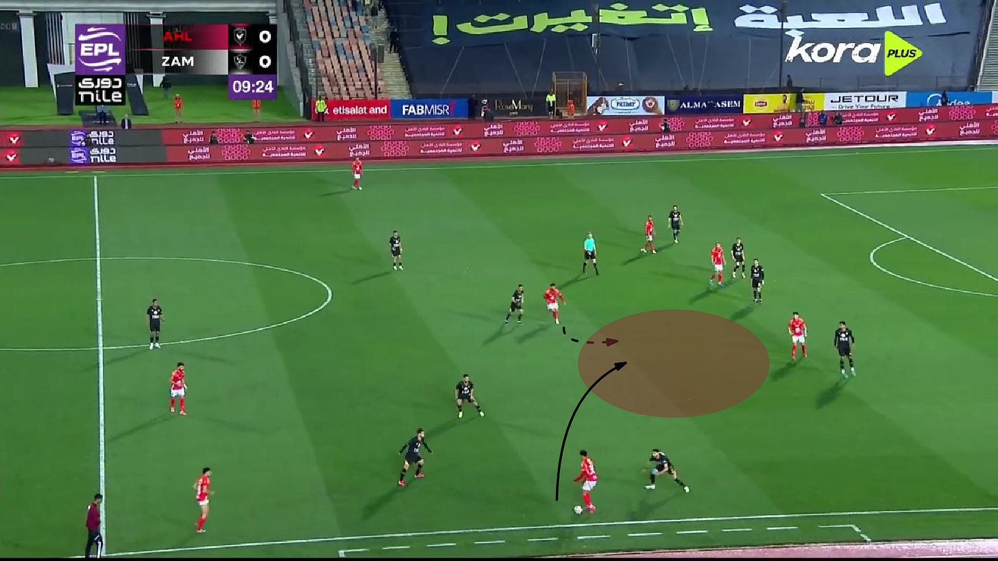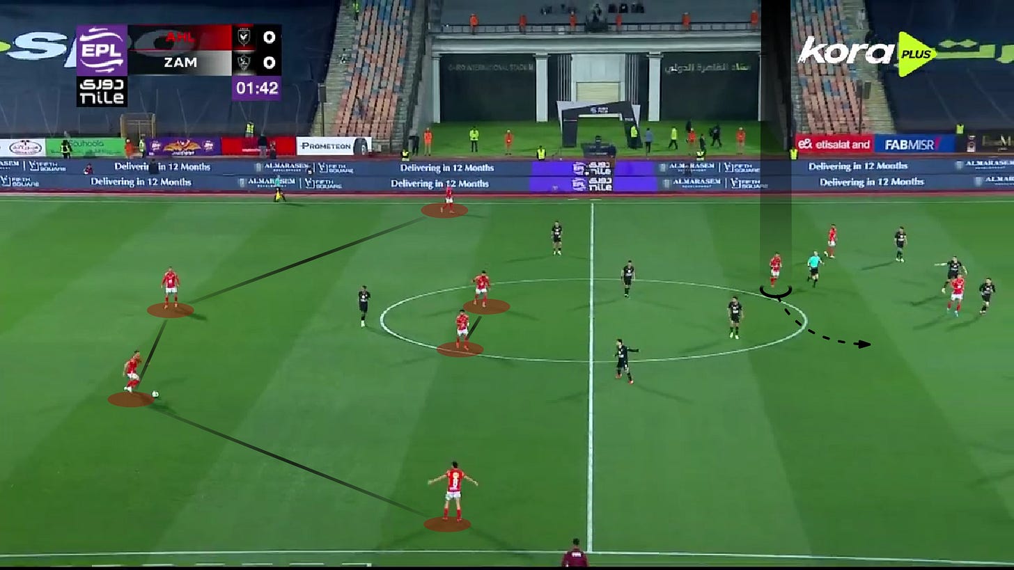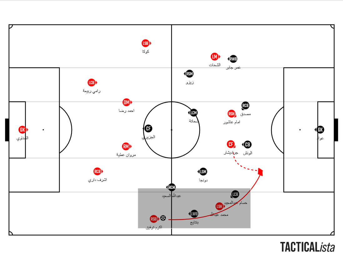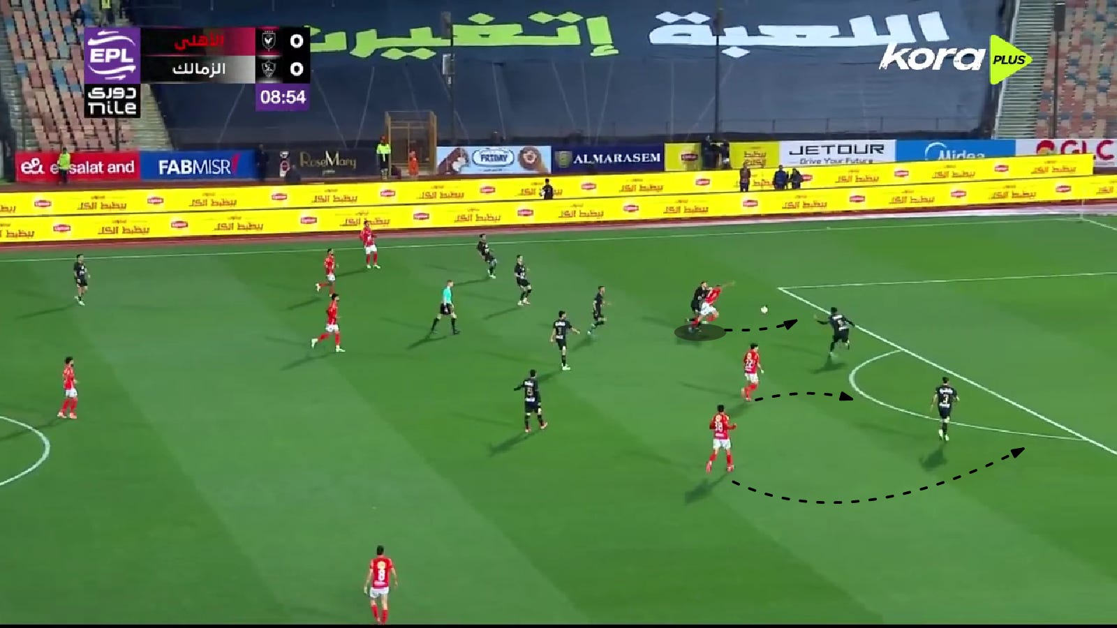 محمد عبد الله جناح الفريق يبدأ في عملية التحرك من الداخل للخارج في إشارة واضحة لاكرم توفيق للعب الكرة الطولية خلف حسام عبد المجيد الذي بدوره قام بستباقية علي محمد عبد الله جناح الاهلي , ولماذا الكرة الطولية ؟ لأن جراديشار وامام عاشور في موقف 1 ضد 1 مع قلبي دفاع الزمالك ويمكنهما الاستباق في الحصول علي الكرة في المساحة