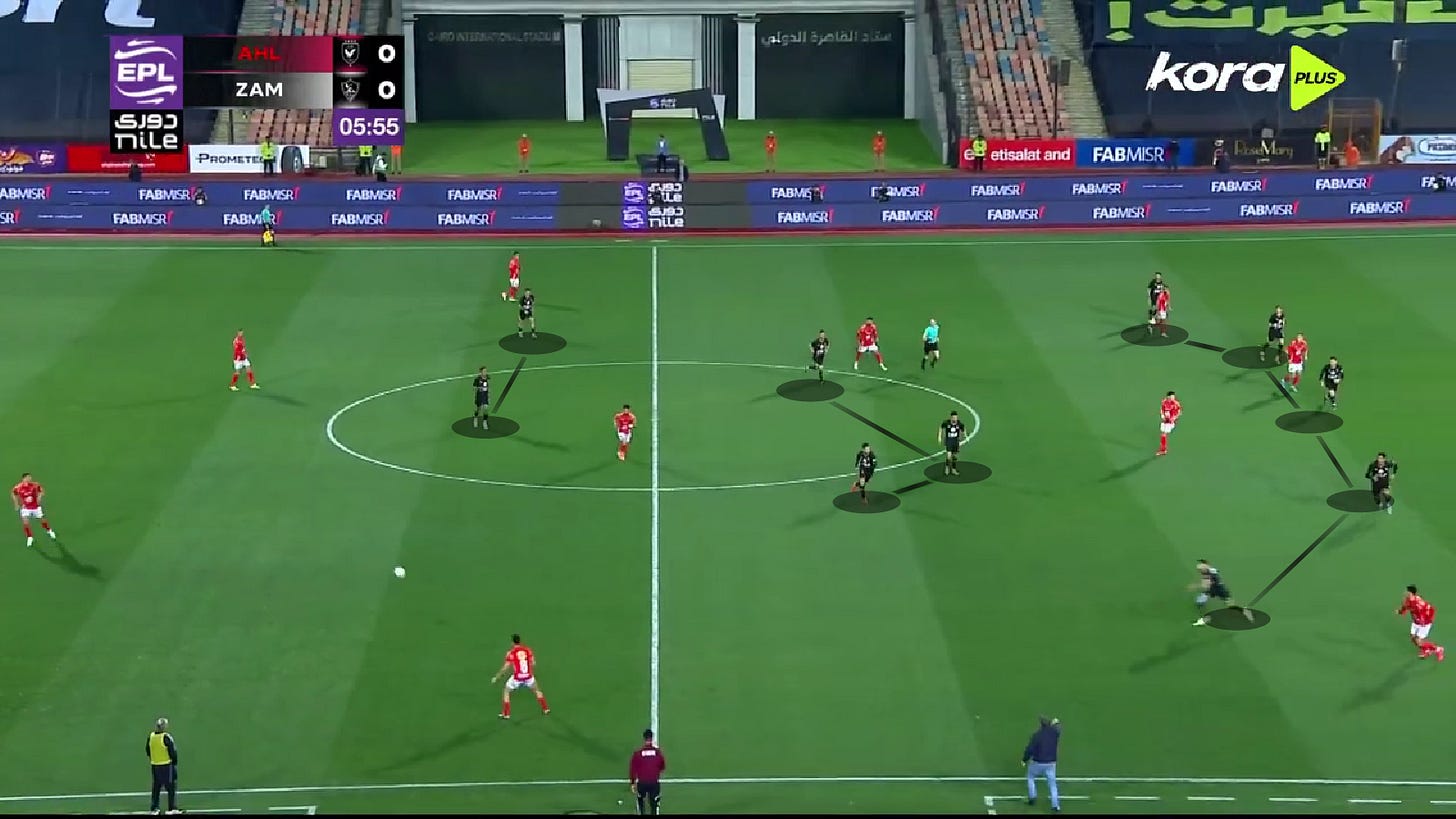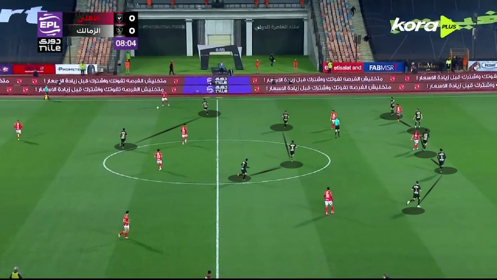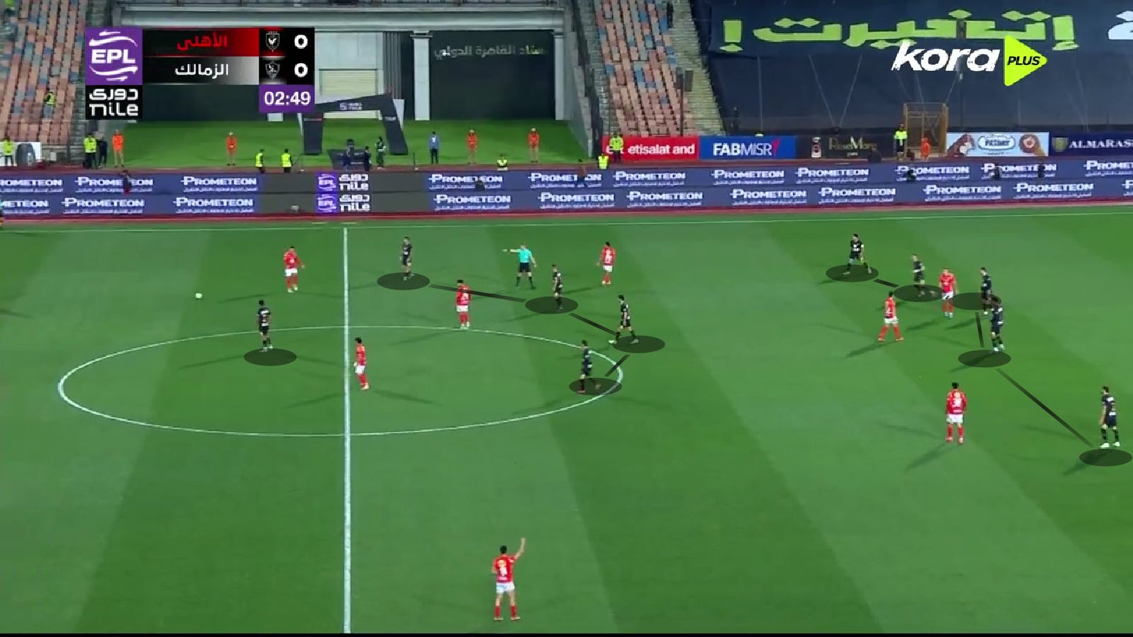 الشكل الثابت لنادي الزمالك كان يتغير بين 5-4-1 و 5-3-2 تبعا لحالة اللعب وأين مكان الكرة ؟ وكيف يتمركز لاعبي الاهلي؟