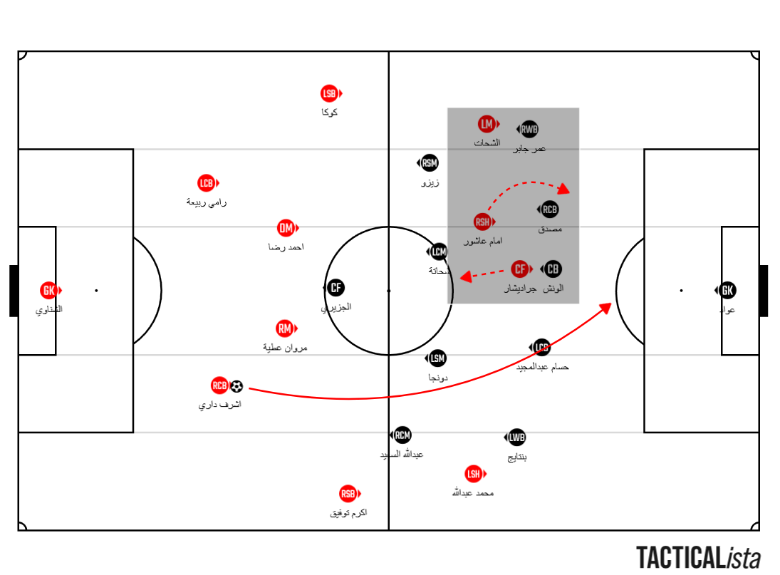 ما الذي اختلف عن الحالة السابقة ؟ هو قرار اللاعب كوكا بالتمرير لجراديشار خلف المساحة التي وفرها حسين الشحات بتحركه بدون كرة مما يعطي الفرصة لجراديشار للاستلام في موقف 1 ضد 1