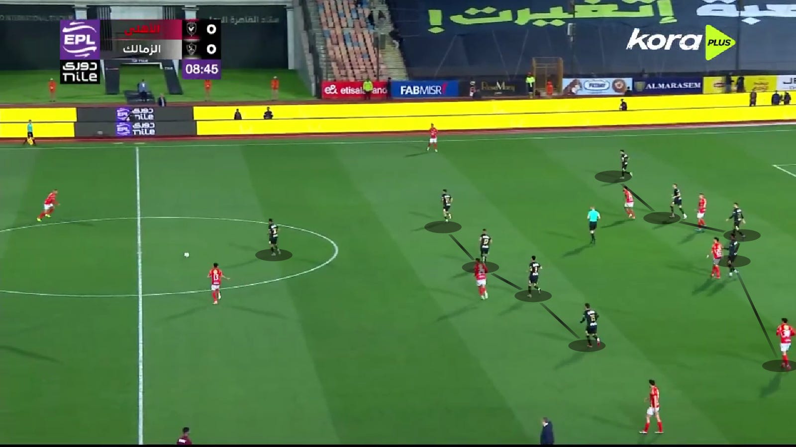 لم يظهر الزمالك بشكل جيد فيما يتعلق بمسألة تأمين العمق والذي يعتبر هو الغرض الأساسي للعب بكتلة متوسطة أو منخفضة -سيتم التوضيح لاحقا- مما كان يعطي الفرصة للاعبي الأهلي في مهاجمة العمق والذي لم يحدث لعدة أسباب