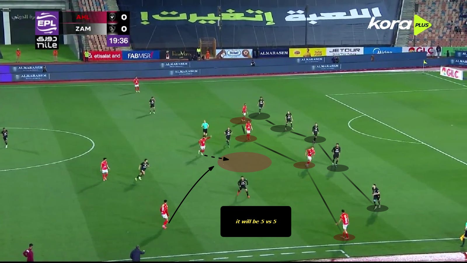 سيبدأ الزمالك بتنفيذ نفس الفكرة التي طبقها في الحالة السابقة عند الدفاع علي الأطراف , وهي خروج "عمر جامر للضغط علي كوكا " فيما يتحرك اللاعب "صندق للضغط علي حسين الشحات الذي يحاول جذبه للاطراف لتفريغ المساحة"