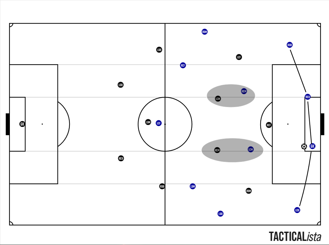 علي الجانب الأيمن يظهر برايتون متفوقا بشكل كامل خلال مرحلة التدرج من خلال موقف 2 ضد 1 علي الأطراف , ولكن لماذا هز دائما متفوق ؟ الأمر يعود لهيكل الفريق