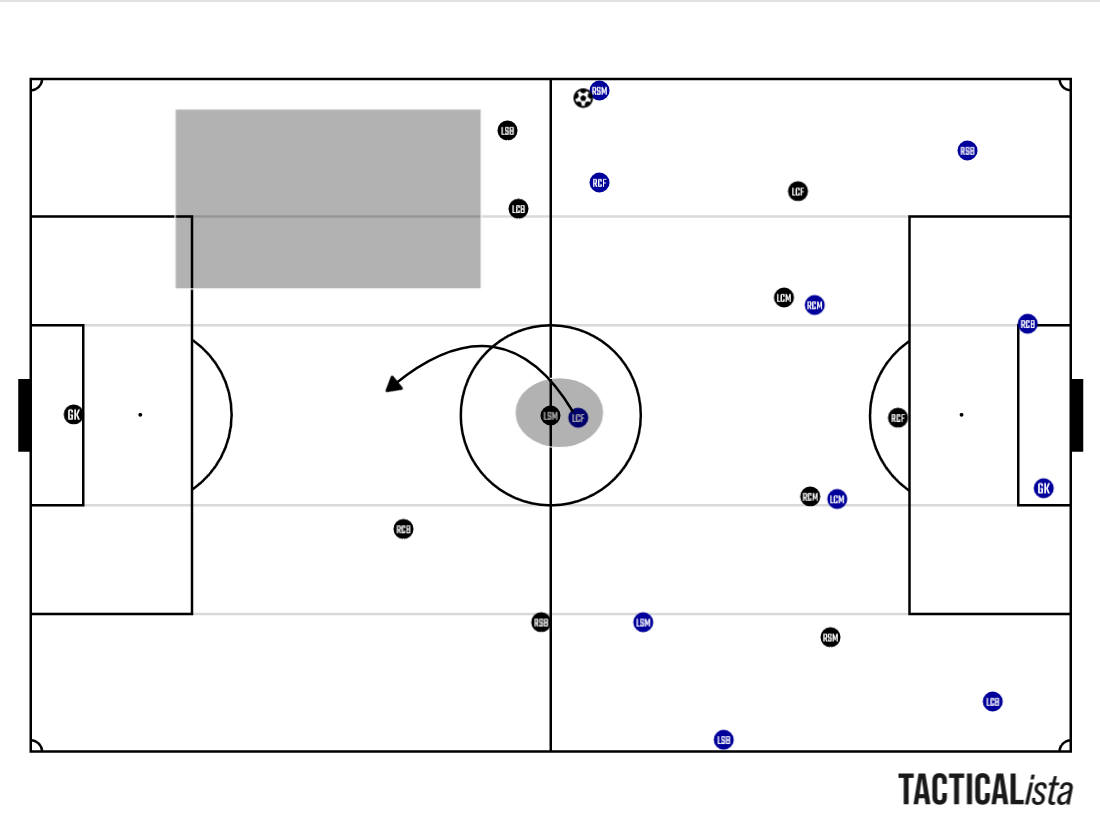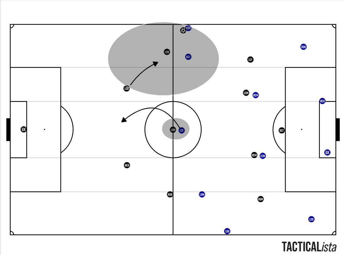يضطر الجناح الأيسر لفولهام للخروج والضغط علي قلب الدفاع الأيمن لبرايتون مما يجعله بعيدا تماما عن إمكانية التغطية مع الظهير الأيسر لفريقه , والسبب الاخر كما ذكرنا هو خروج احد المحورين للضغط علي محور برايتون مما يجعل مهمته معقدة في تحديد قراره .