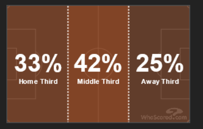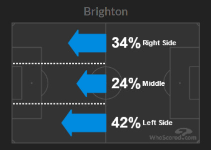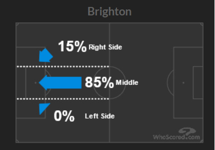برايتون استهدف المنطقة المركزية في تسديداته والتي كانت أغلبها من حدود منطقة الجزاء , أي يمكن استنتاج أن الفريق كان يستهدف التقدم من كلا الطرفين (خاصة الأيسر) من أجل الانهاء والتسديد في المنطقة الوسطي .